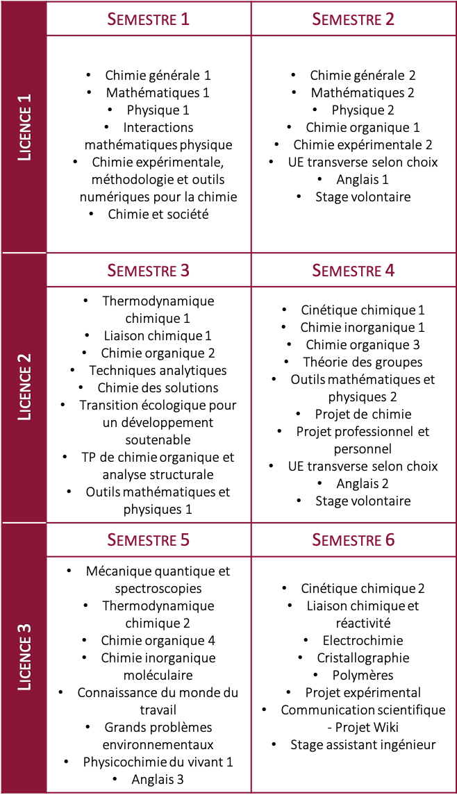 En première année (L1), les étudiants découvrent les disciplines fondamentales (mathématiques, physique, chimie) à travers un programme équilibré et illustré. En deuxième et troisième années (L2 et L3), le contenu pédagogique se concentre davantage sur la chimie tout en intégrant des enseignements transverses et complémentaires pour élargir les perspectives des étudiants. Des unités d’enseignements (UE) transverses telles que « engagement étudiant », « sports », « innovations pédagogiques », « égalités », « transition écologique et enjeux sociétaux » sont ainsi proposées aux étudiants pour enrichir leur parcours.