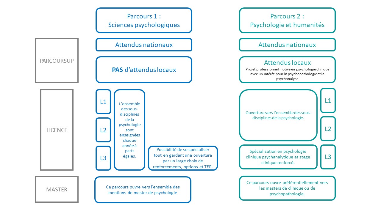 Ainsi, le parcours « Sciences psychologiques » maintient des enseignements diversifiés dans l’ensemble des sous-disciplines de la psychologie à part égale sur l’ensemble du cycle, de la L1 à la L3, alors que le parcours « Psychologie et Humanités » opère une spécialisation progressive vers la psychologie clinique et la psychopathologie psychanalytique en L3.
