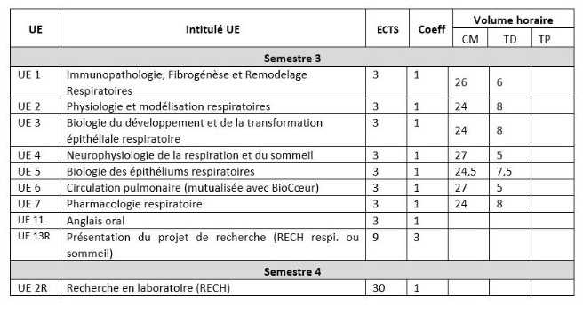Les objectifs de la spécialité sont l’acquisition de connaissances fondamentales nécessaires à la compréhension des mécanismes impliqués dans les pathologies respiratoires. Cet enseignement est ouvert à la formation continue de médecins (pneumologue, pédiatres, anesthésistes- réanimateurs…), pharmaciens, kinésithérapeutes, ingénieurs, scientifiques, afin d’aborder les nouveaux concepts et les technologies innovantes nécessaires au développement d’une activité de recherche originale impliquant notions fondamentales et applications cliniques.